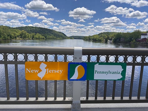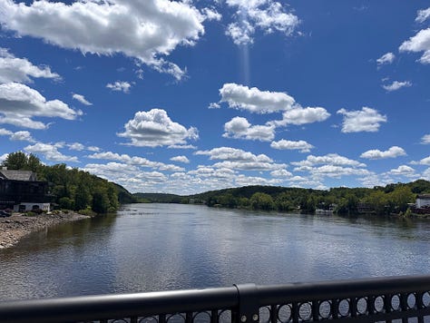We crossed the Delaware River into New Jersey and back into Pennsylvaina in New Hope. The bridge was packed. We had to dismount and walk our bikes through the slow churn of people, flip-flops, kids with lemonade, dogs on leashes and some in strollers, a few other bikers. Every time I shifted my weight, my sneakers made static against the pavement and sent a little shock of electricity up my fingers through the handlebars. It felt silly and slightly magical, as if my body was saying: You’re too much in motion. Slow down.