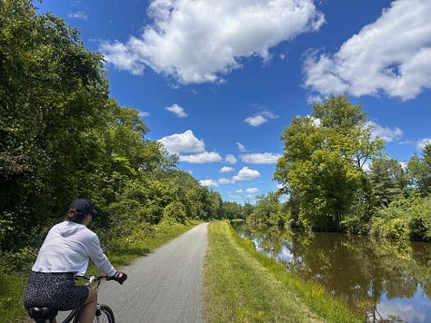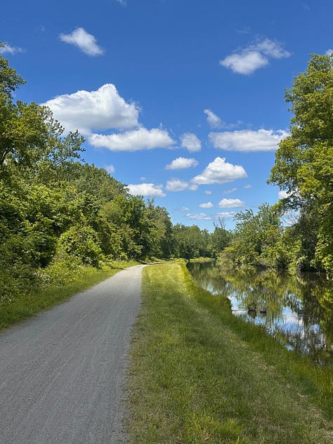 I spent Memorial Day on a bike ride. It was slightly humid, one of those days where the sky promises summer but the air still holds the breath of spring. The sky, after days of rain, was blue. Dan and I set out from Washington Crossing and followed the canal path north, past wildflowers and poplars, crossing into New Jersey and looping back into Pennsylvania through New Hope, where the crowds had already begun to gather for Memorial Day.